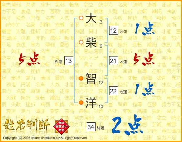 あなたの人生を表す1番重要な運勢です。生涯を通じて影響する総合運となり、主に50歳以降の晩年期に影響を及ぼします。苗字と名前の合計画数。