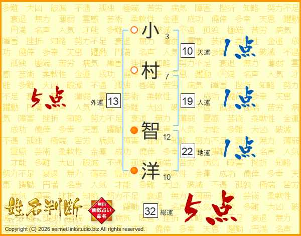 生活面を象徴する運勢です。外部から受ける影響力を表し、結婚運、家庭運や職場、環境への順応性を表します。総運から人運を引いた画数。姓や名が1文字の場合を除く。