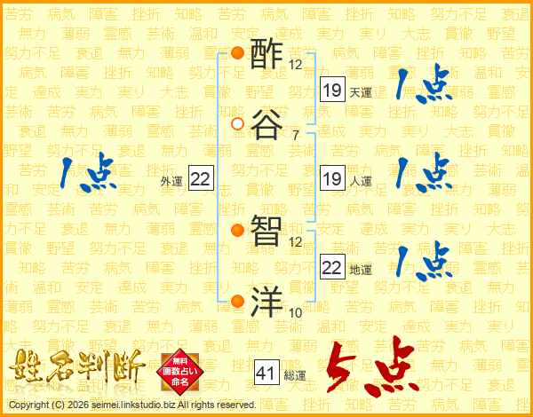生活面を象徴する運勢です。外部から受ける影響力を表し、結婚運、家庭運や職場、環境への順応性を表します。総運から人運を引いた画数。姓や名が1文字の場合を除く。