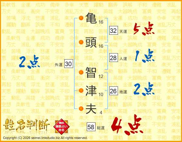 亀頭智津夫さんの総運は58画の4点!