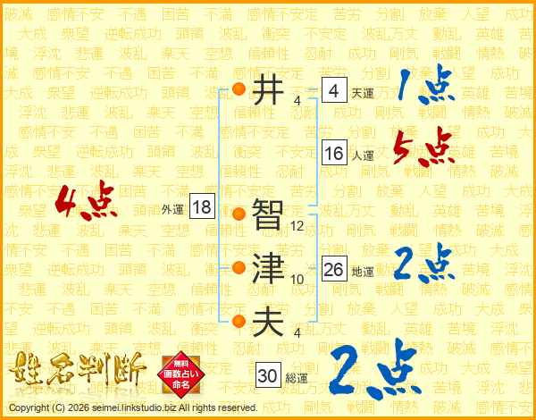 井(4画) 智(12画)津(10画)夫(4画)
