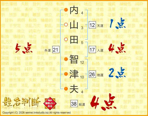 内(4画)山(3画)田(5画) 智(12画)津(10画)夫(4画)