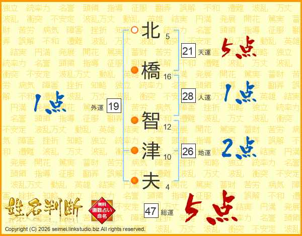 北(5画)橋(16画) 智(12画)津(10画)夫(4画)