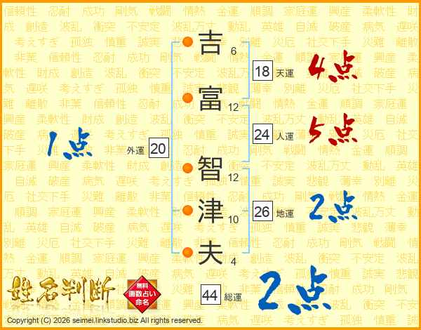 吉(6画)富(12画) 智(12画)津(10画)夫(4画)