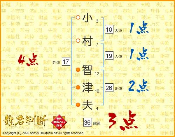 小(3画)村(7画) 智(12画)津(10画)夫(4画)