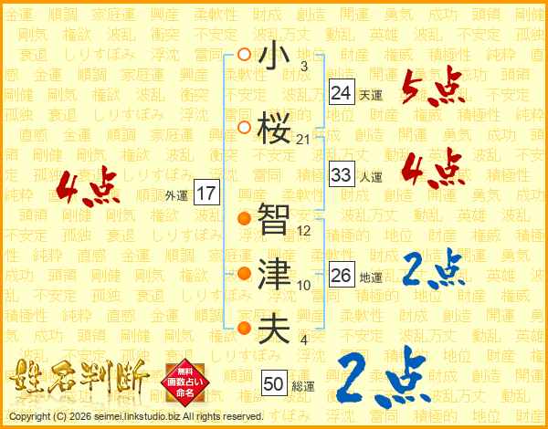 小(3画)桜(21画) 智(12画)津(10画)夫(4画)