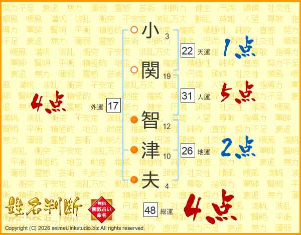 小(3画)関(19画) 智(12画)津(10画)夫(4画)