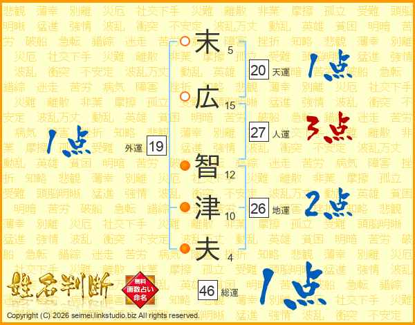 末(5画)広(15画) 智(12画)津(10画)夫(4画)