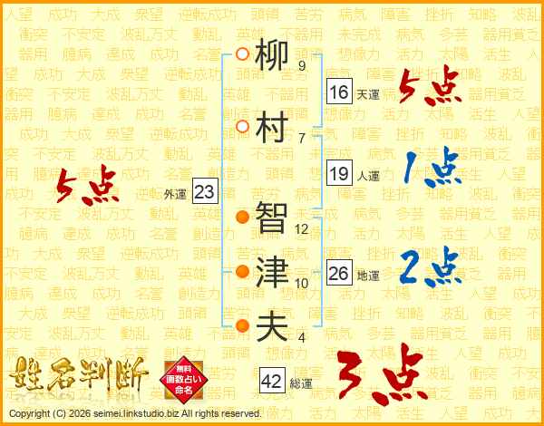 柳(9画)村(7画) 智(12画)津(10画)夫(4画)