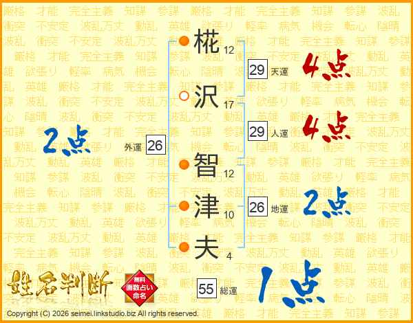 椛(12画)沢(17画) 智(12画)津(10画)夫(4画)