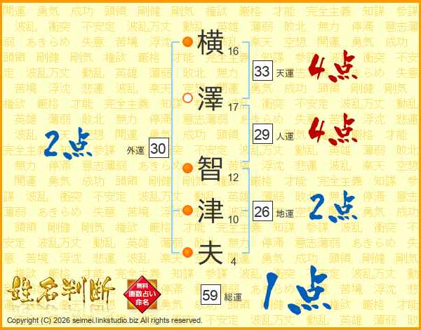横(16画)澤(17画) 智(12画)津(10画)夫(4画)