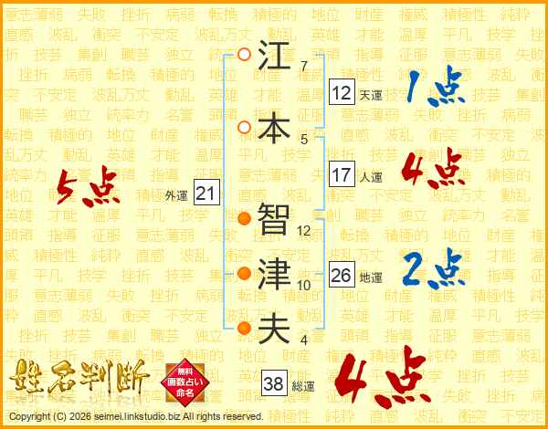江(7画)本(5画) 智(12画)津(10画)夫(4画)