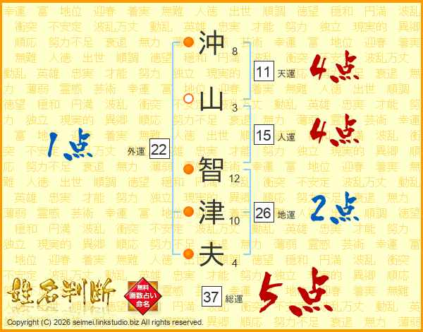 沖(8画)山(3画) 智(12画)津(10画)夫(4画)
