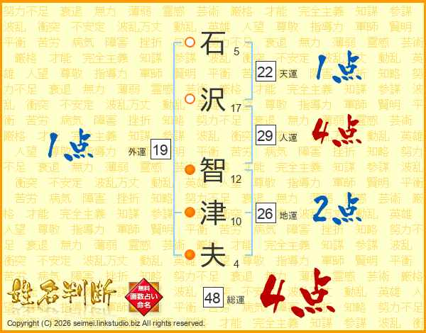 石(5画)沢(17画) 智(12画)津(10画)夫(4画)