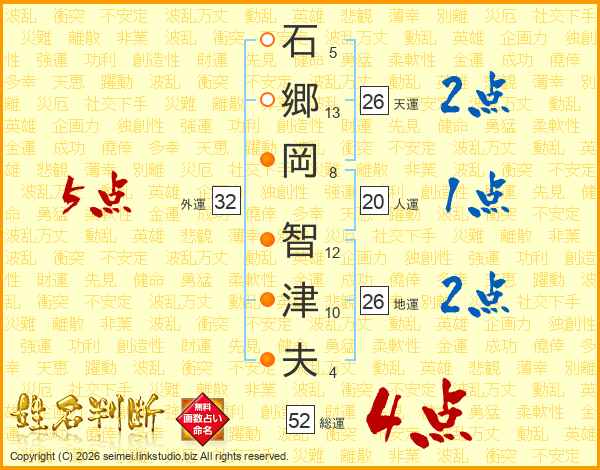 石郷岡智津夫さんの総運は52画の4点!