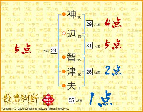 神(10画)辺(19画) 智(12画)津(10画)夫(4画)