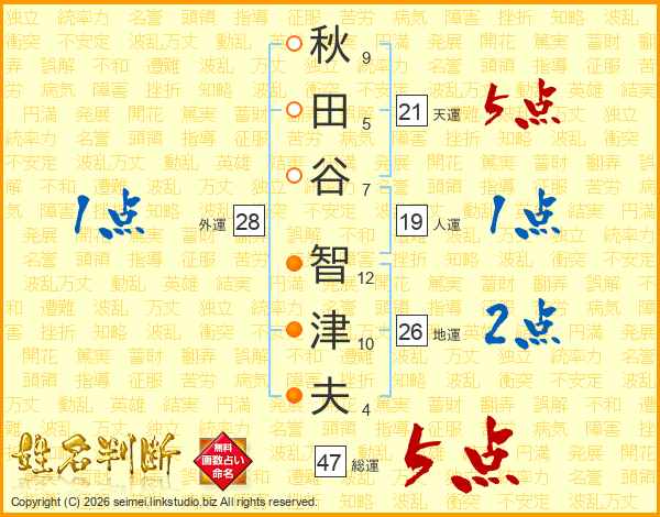 秋(9画)田(5画)谷(7画) 智(12画)津(10画)夫(4画)
