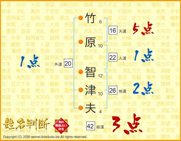竹原智津夫さんの地運は26画の2点!