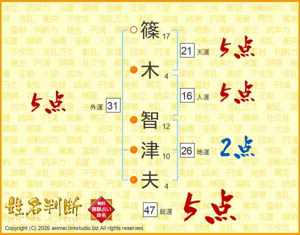 篠(17画)木(4画) 智(12画)津(10画)夫(4画)