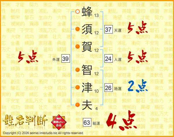 蜂(13画)須(12画)賀(12画) 智(12画)津(10画)夫(4画)