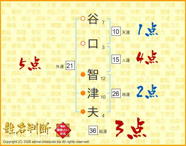 谷(7画)口(3画) 智(12画)津(10画)夫(4画)