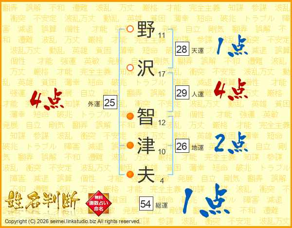 野(11画)沢(17画) 智(12画)津(10画)夫(4画)