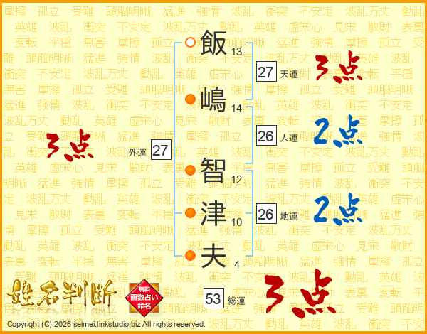 飯(13画)嶋(14画) 智(12画)津(10画)夫(4画)