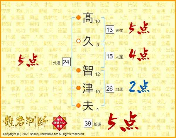髙(10画)久(3画) 智(12画)津(10画)夫(4画)