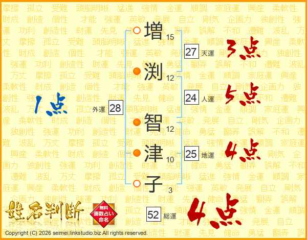 増(15画)渕(12画) 智(12画)津(10画)子(3画)
