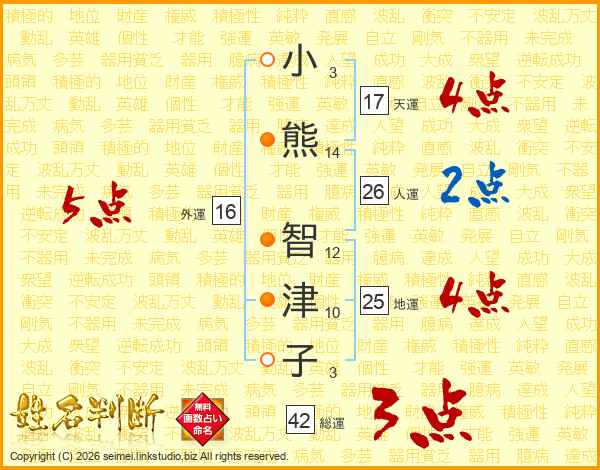 小(3画)熊(14画) 智(12画)津(10画)子(3画)