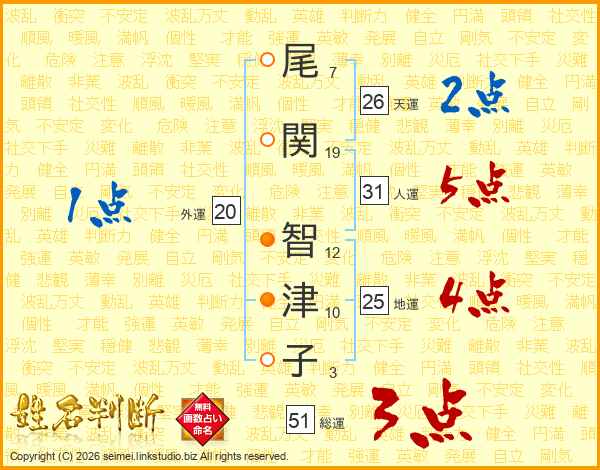 尾(7画)関(19画) 智(12画)津(10画)子(3画)