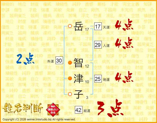 あなたの人生を表す1番重要な運勢です。生涯を通じて影響する総合運となり、主に50歳以降の晩年期に影響を及ぼします。苗字と名前の合計画数。
