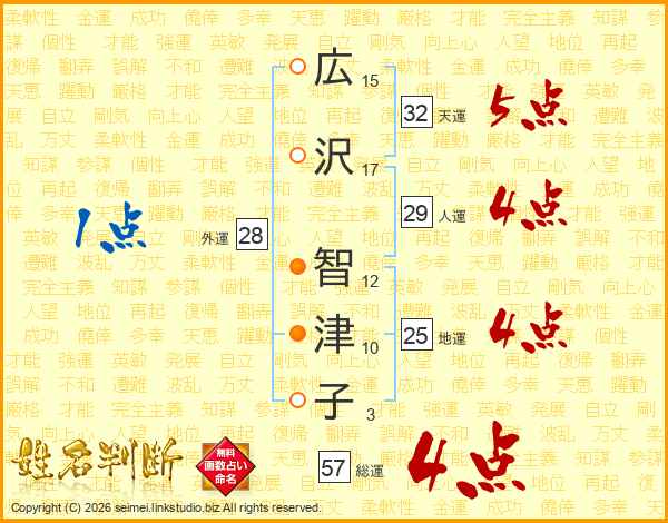 広(15画)沢(17画) 智(12画)津(10画)子(3画)