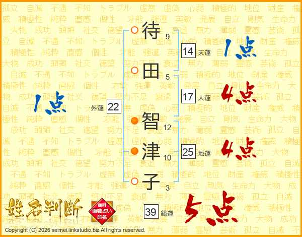 待(9画)田(5画) 智(12画)津(10画)子(3画)