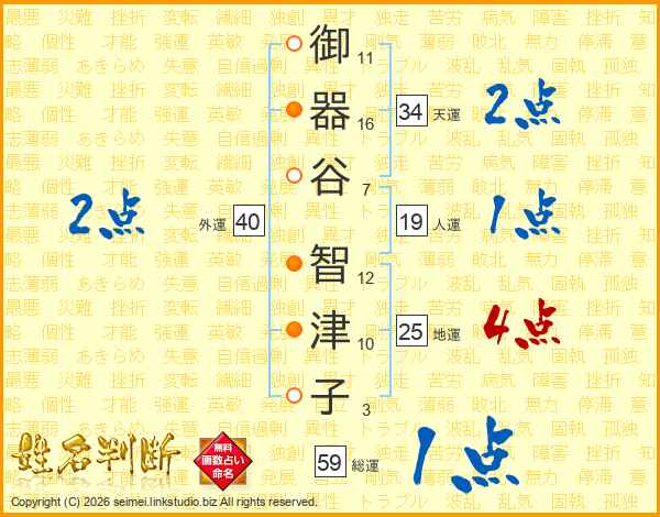 御(11画)器(16画)谷(7画) 智(12画)津(10画)子(3画)
