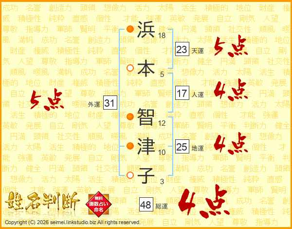 浜(18画)本(5画) 智(12画)津(10画)子(3画)