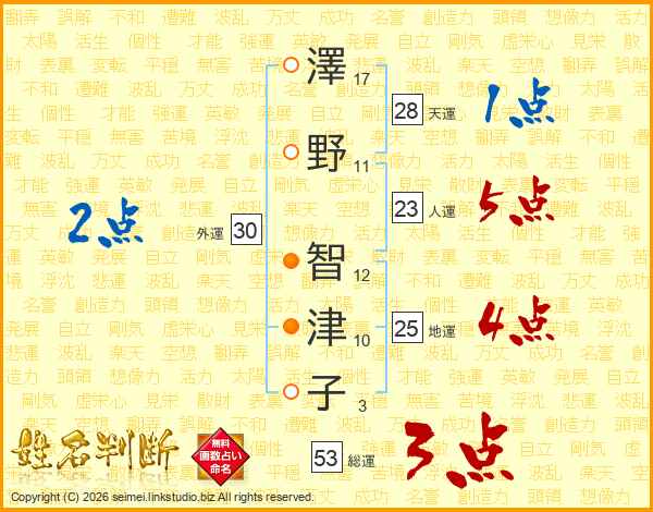 澤(17画)野(11画) 智(12画)津(10画)子(3画)