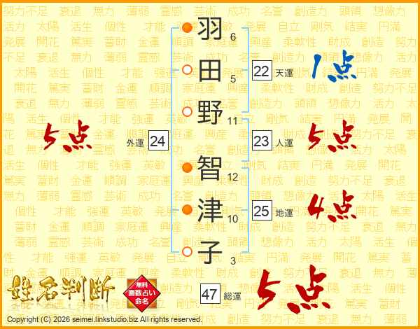羽(6画)田(5画)野(11画) 智(12画)津(10画)子(3画)
