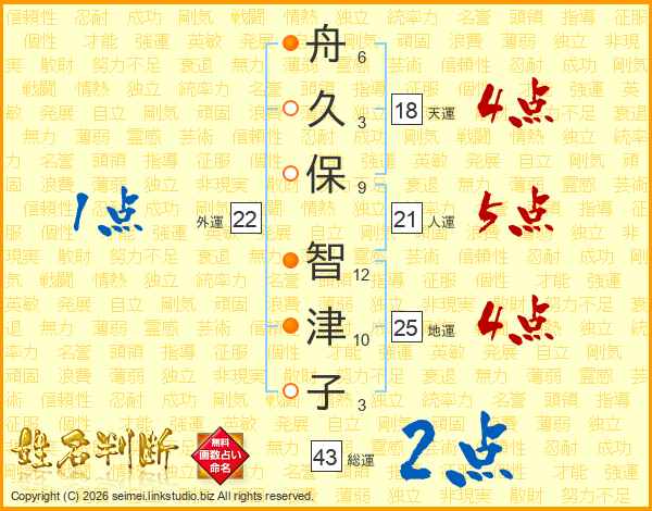 舟(6画)久(3画)保(9画) 智(12画)津(10画)子(3画)
