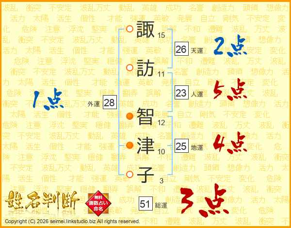 諏(15画)訪(11画) 智(12画)津(10画)子(3画)
