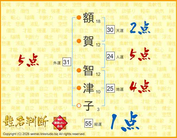 額(18画)賀(12画) 智(12画)津(10画)子(3画)