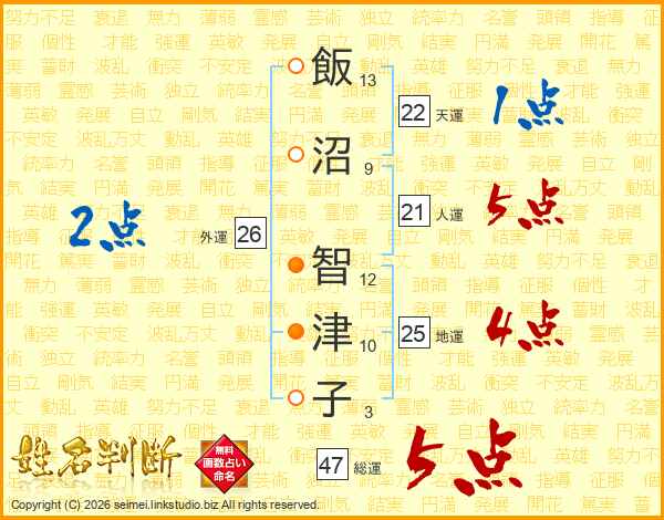 飯(13画)沼(9画) 智(12画)津(10画)子(3画)