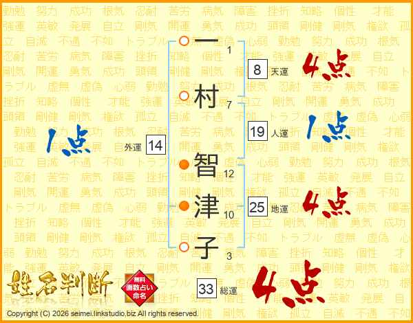 一(1画)村(7画) 智(12画)津(10画)子(3画)