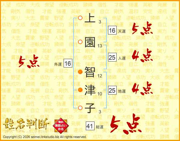 上(3画)園(13画) 智(12画)津(10画)子(3画)