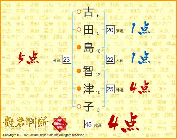 古(5画)田(5画)島(10画) 智(12画)津(10画)子(3画)