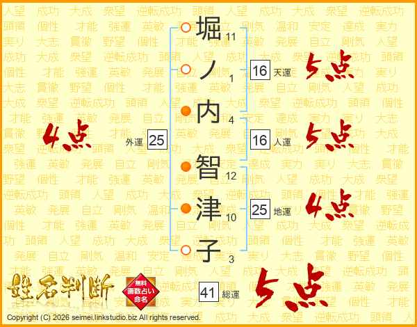 堀ノ内智津子さんの総運は41画の5点!
