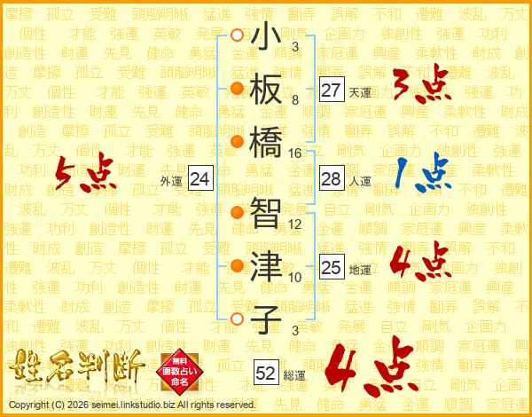 小(3画)板(8画)橋(16画) 智(12画)津(10画)子(3画)