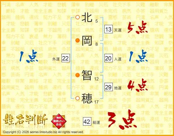 生活面を象徴する運勢です。外部から受ける影響力を表し、結婚運、家庭運や職場、環境への順応性を表します。総運から人運を引いた画数。姓や名が1文字の場合を除く。