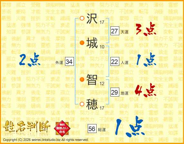 生活面を象徴する運勢です。外部から受ける影響力を表し、結婚運、家庭運や職場、環境への順応性を表します。総運から人運を引いた画数。姓や名が1文字の場合を除く。