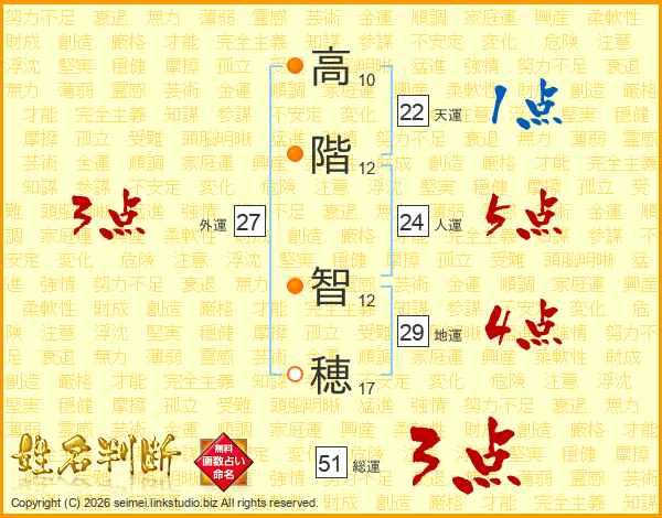 生活面を象徴する運勢です。外部から受ける影響力を表し、結婚運、家庭運や職場、環境への順応性を表します。総運から人運を引いた画数。姓や名が1文字の場合を除く。